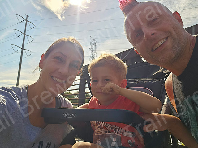 This trail section has restrooms in the public parking lot, open seasonally. You can also use the restroom at the brewery, which has a diaper changing table in the women's bathroom.